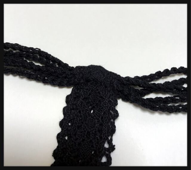 首の後ろに、レースリボンが付いていて、