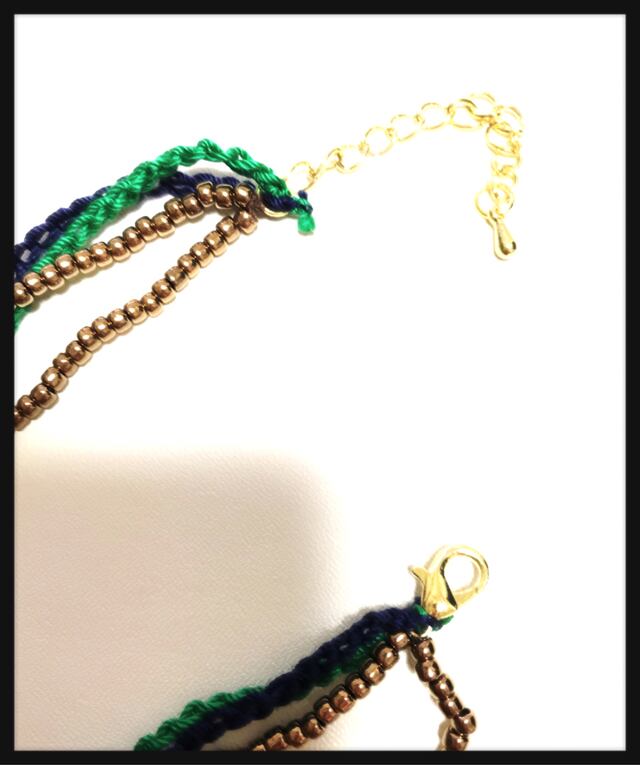 【送料無料】手編みチェーン×ビーズ 4連ブレスレット グリーン×ネイビー ハンドメイド アクセサリー